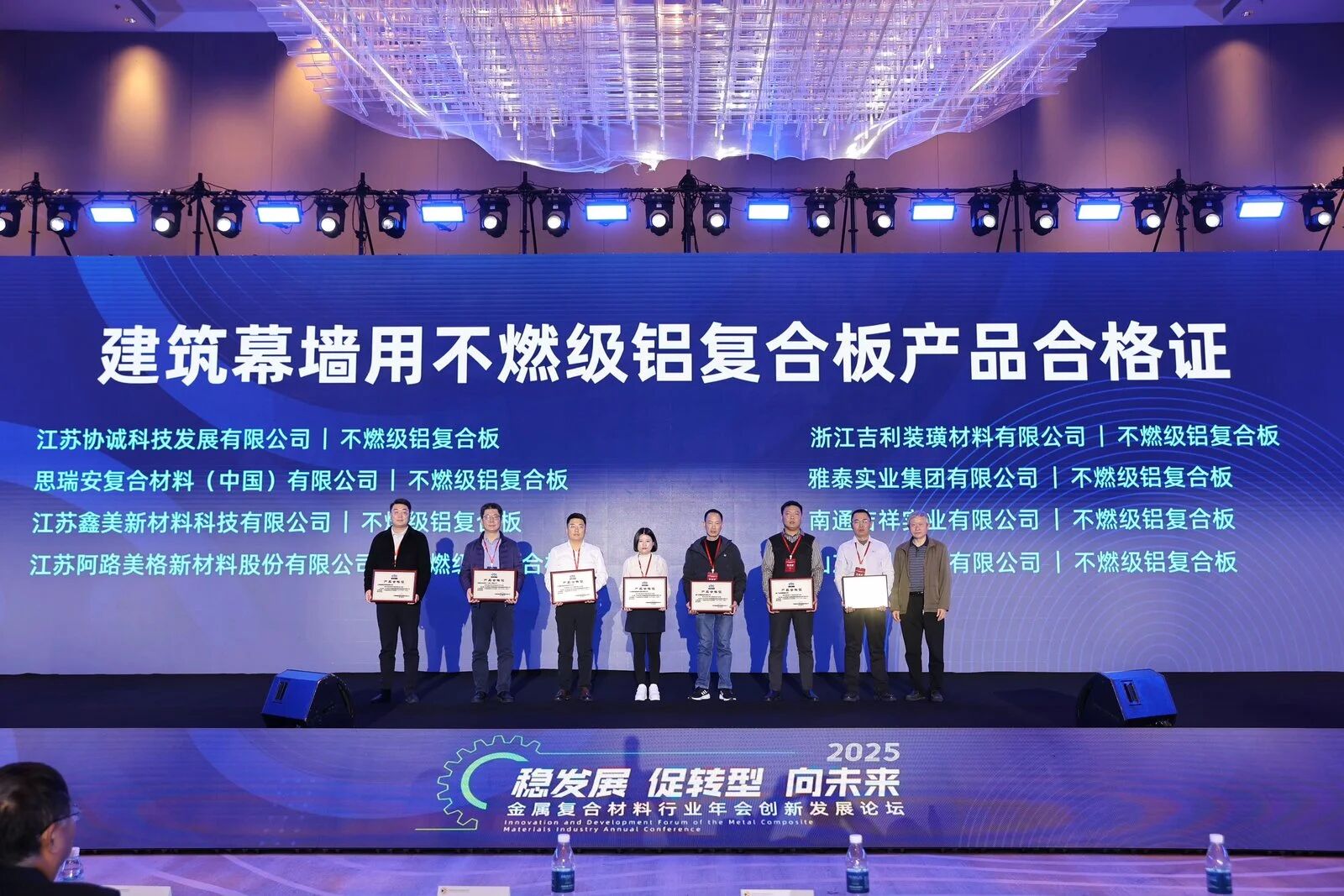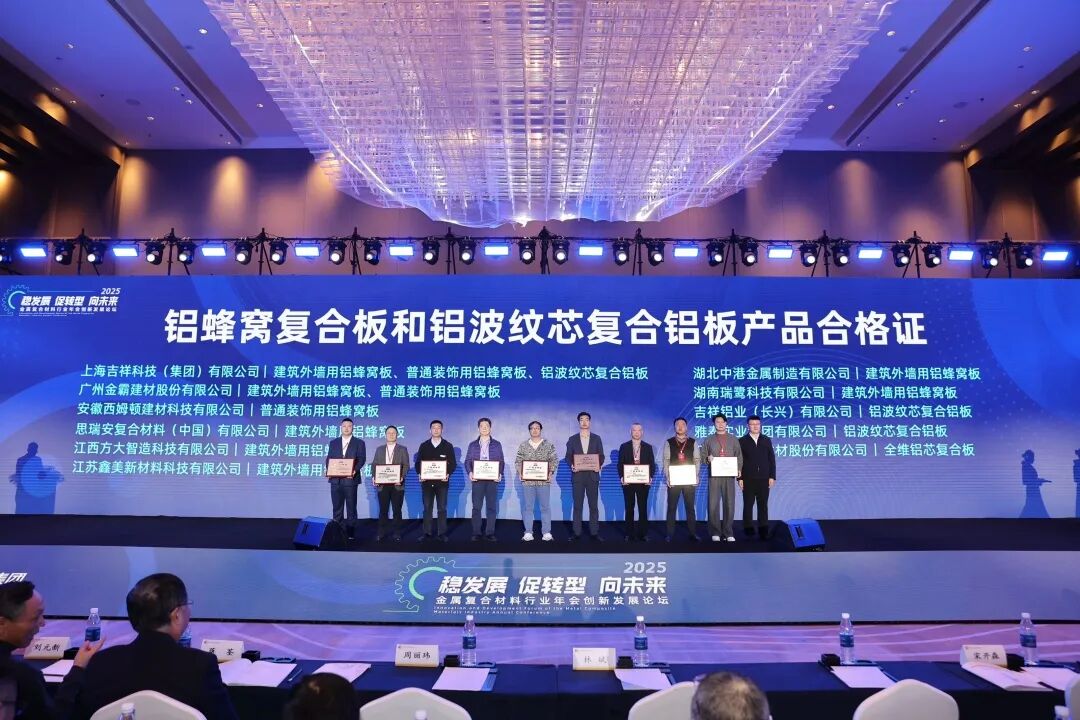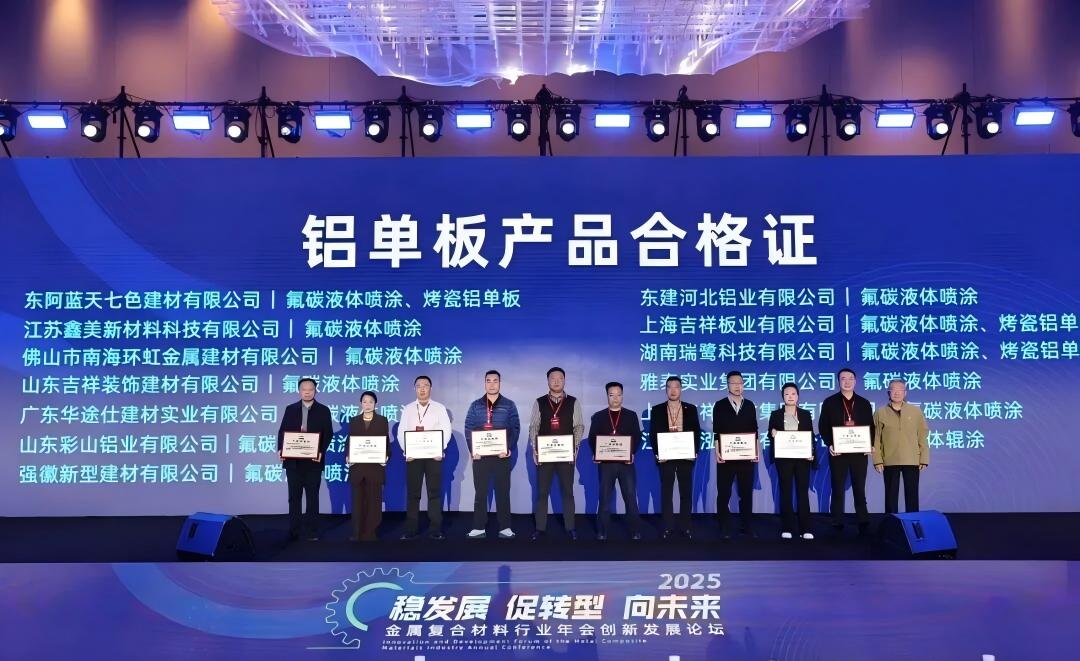 雅泰實(shí)業(yè)集團(tuán)參加本次年會(huì),會(huì)上,集團(tuán)的氟碳液體噴涂鋁單板、不燃級(jí)鋁復(fù)合板、鋁波紋芯復(fù)合鋁板等產(chǎn)品分別榮獲“新國(guó)標(biāo),高質(zhì)量”產(chǎn)品合格證。